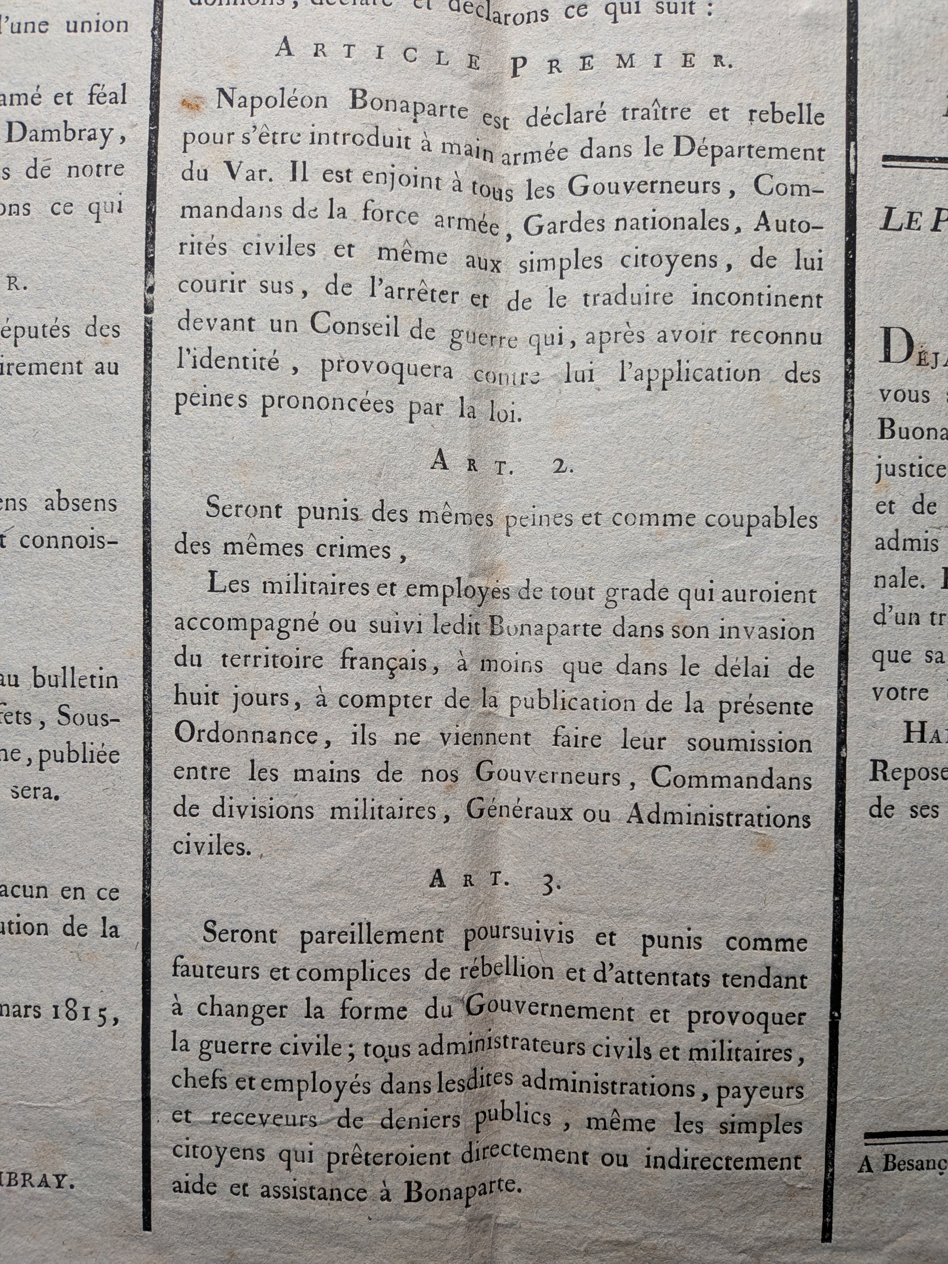 Napoléon Bonaparte est déclaré traître et rebelle pour s'être introduit à main armée dans le Département du Var. Il est enjoint à tous les Gouverneurs, Commandans de la force armée, Gardes nationales, Autorités civiles et même aux simples citoyens, de lui courir sus, de l'arrêter et de la traduire incontinent devant un Conseil de guerre qui, après avoir reconnu l'identité, provoquera contre lui l'application des peines prononcées par la loi.