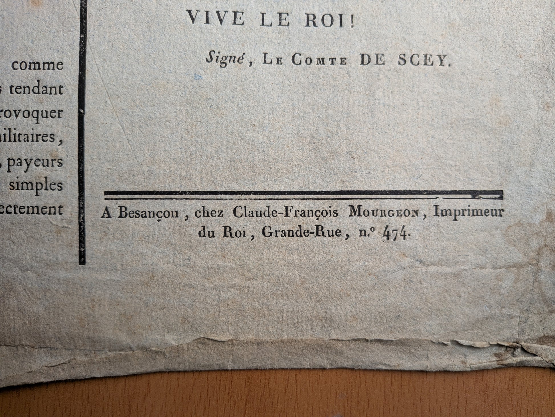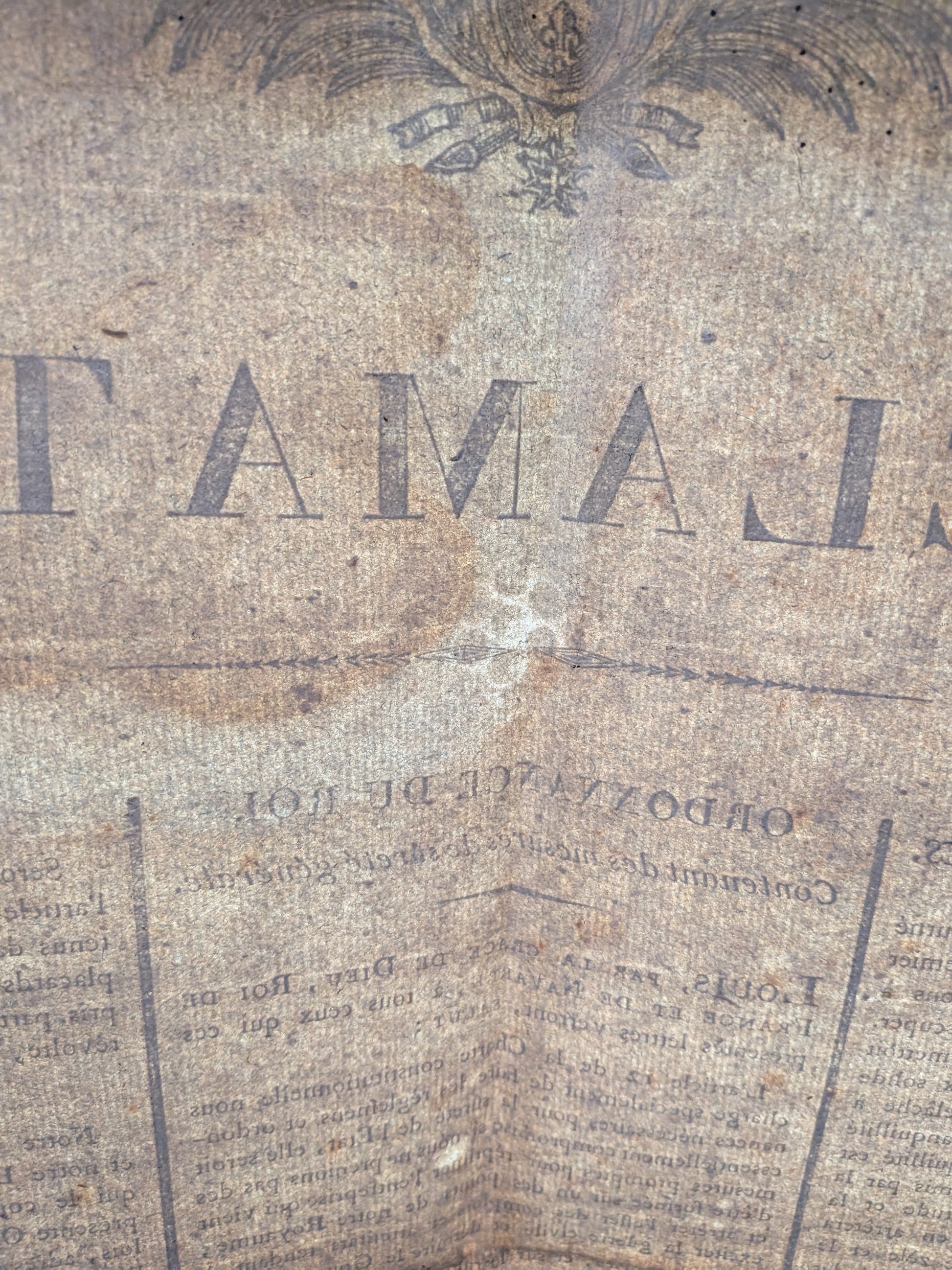 Placard/Affiche sur papier vergé filigrané aux armes de Louis XVIII en-tête