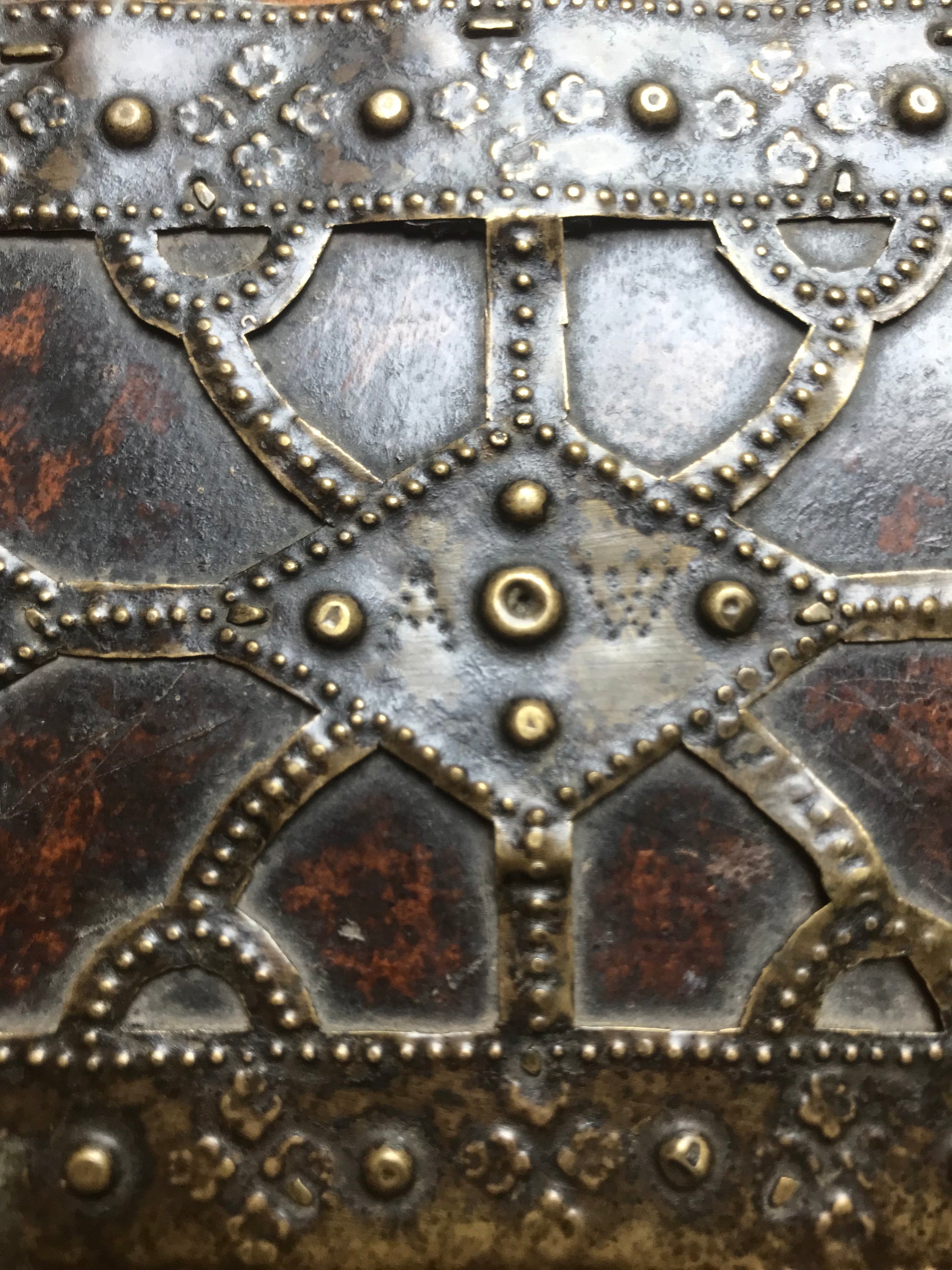 Plats cuir et métal repoussé avec cabochons et fleurs