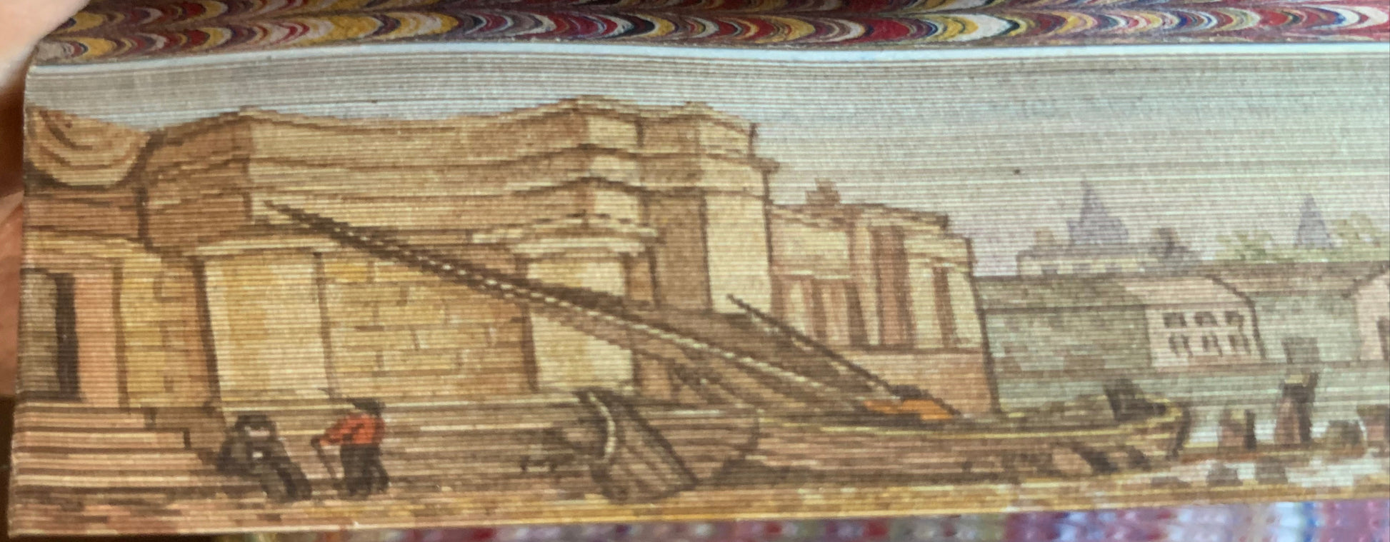 Fore-edge painting ; tranche aquarellée à la main représentant une scène d'une ville au bord de l'eau.