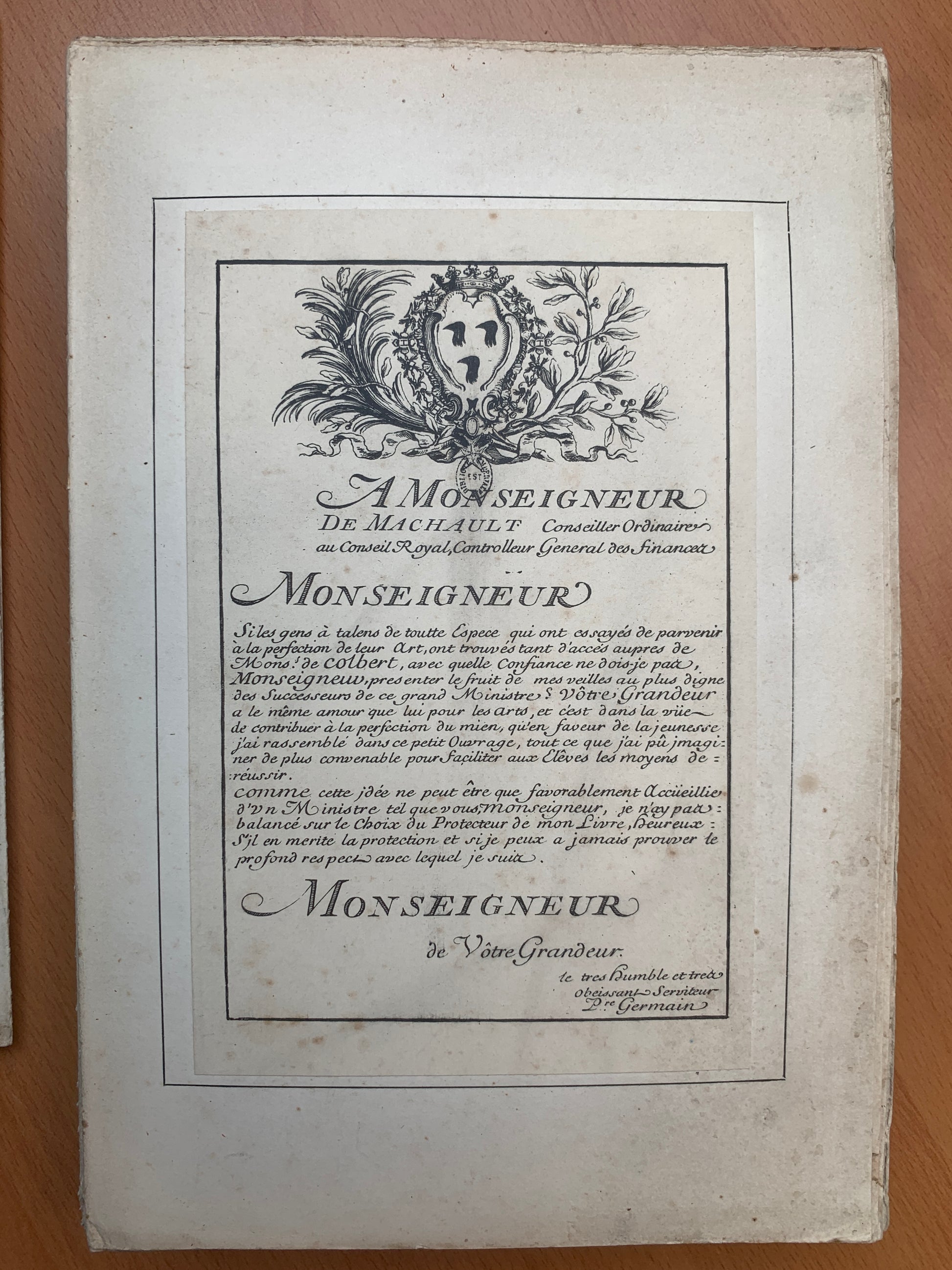 2 pages de titres, une page de table des dessins, une page dédicatoire à monseigneur Machault et une page d'avis.