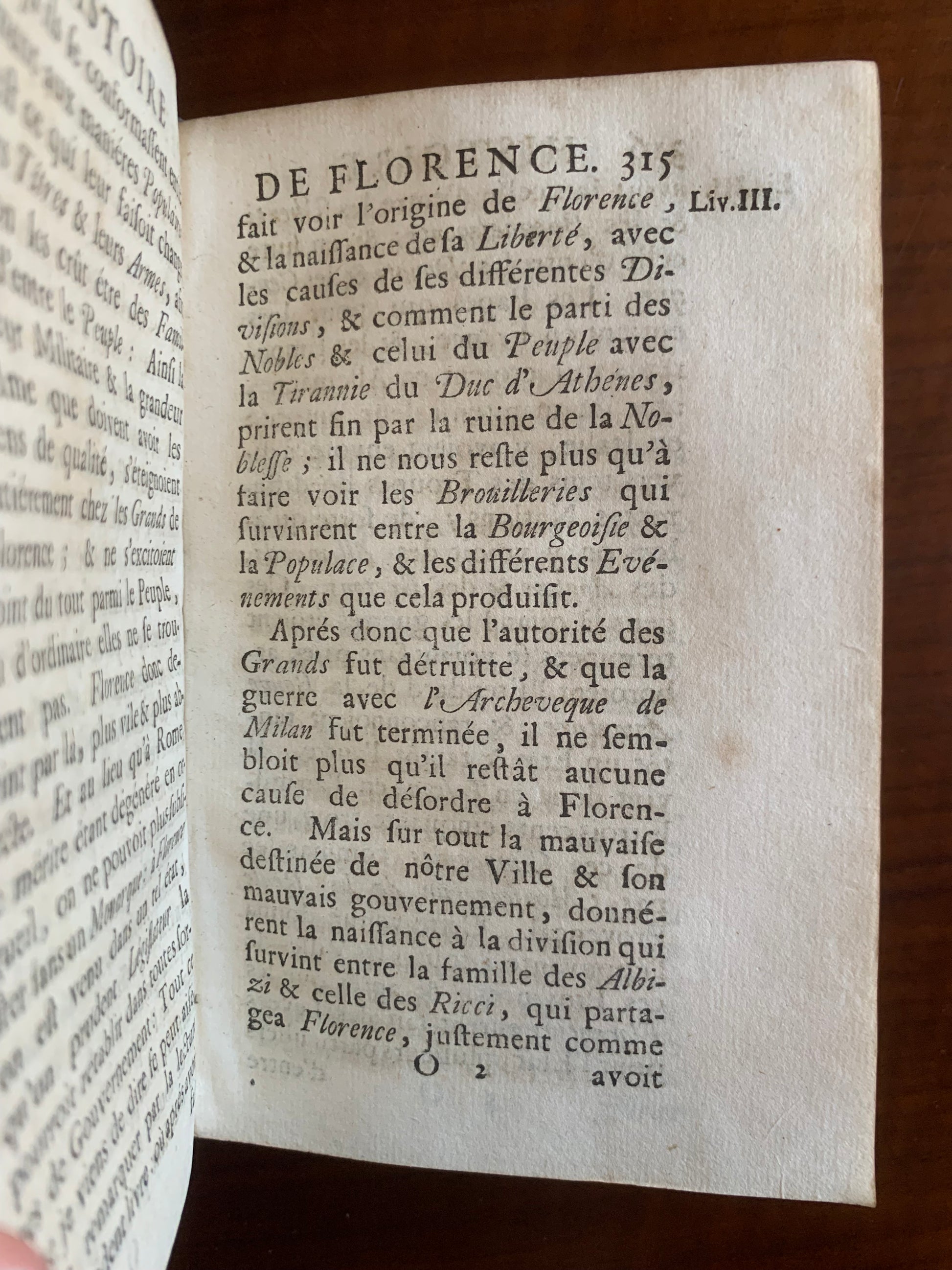 Complet en deux tomes, reliés à la suite, de 588 et 624 pages et sommaire des matières pour chaque tome + 6 pages "lettre de Nicolas Machiavel au pape Clément sept + 10 pages de préface de l'auteur + 9 pages d'avis au lecteur sur la traduction de l'histoire de Florence