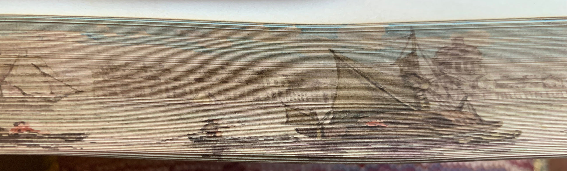 Fore-edge painting ; tranche aquarellée à la main représentant une scène de bateaux et d'une ville au bord de l'eau.