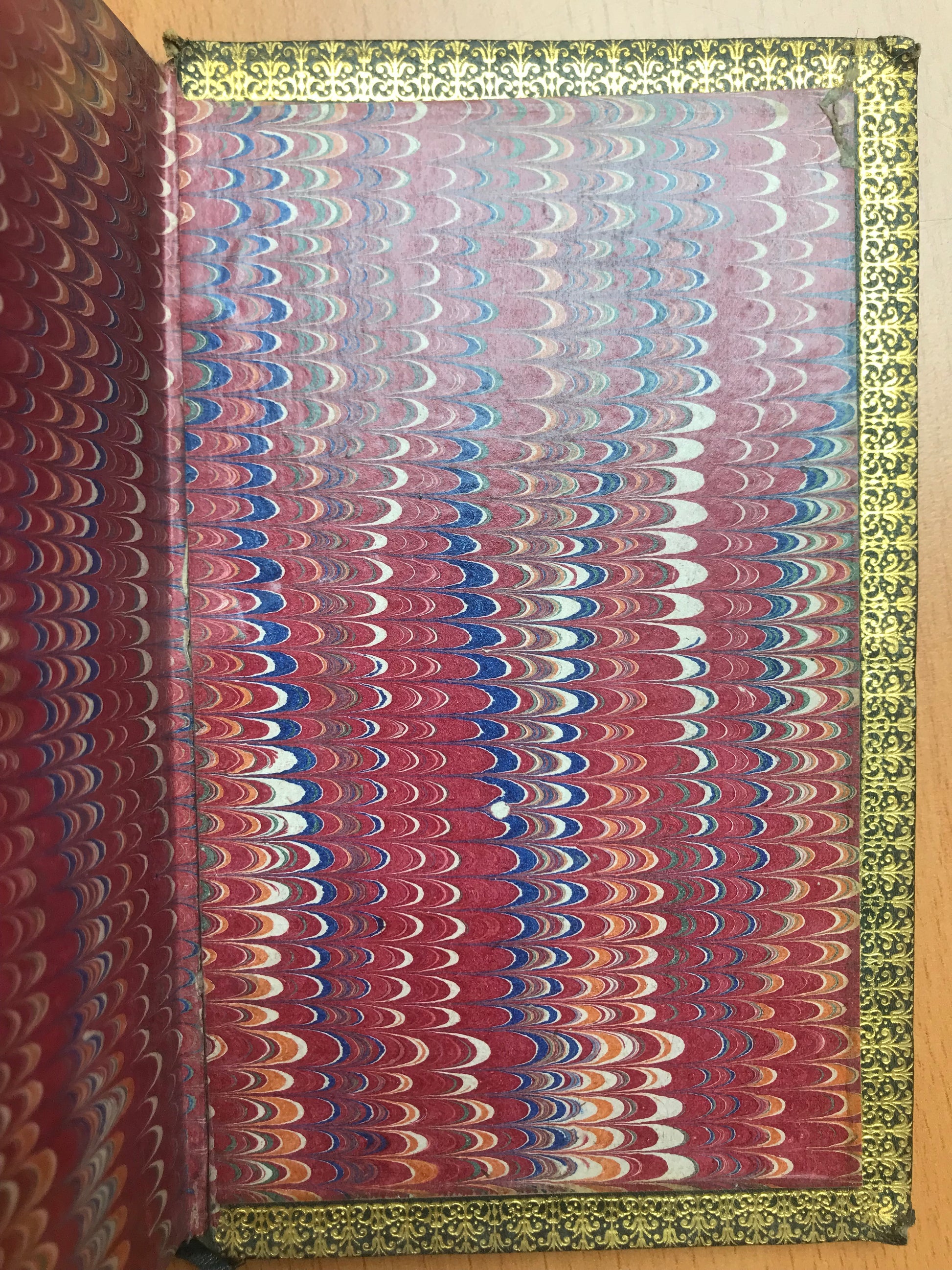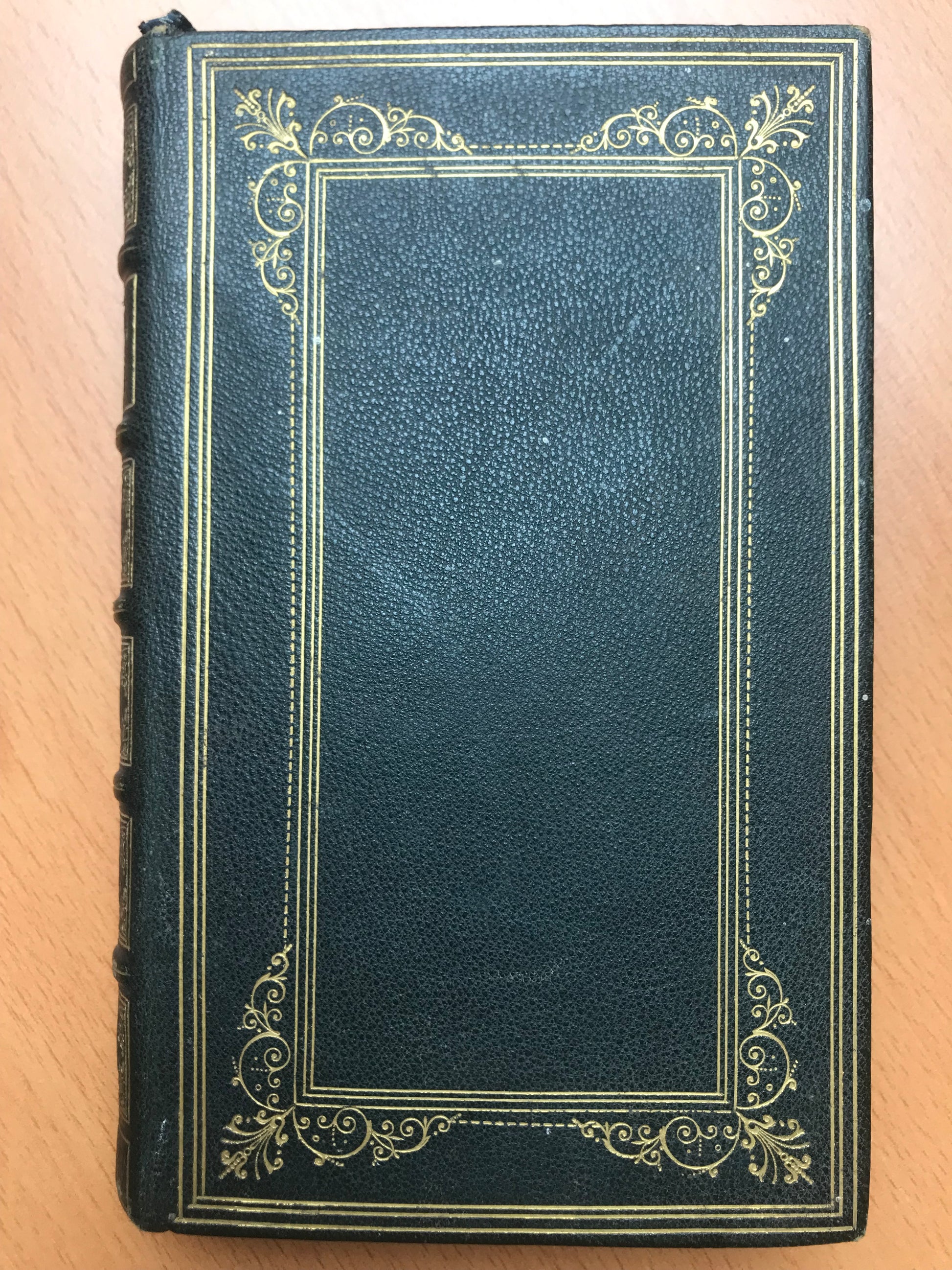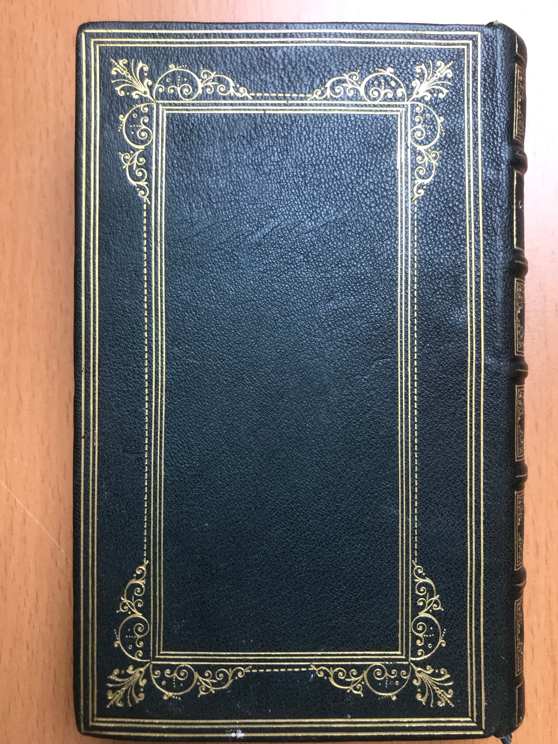 Ouvrage relié plein chagrin, dos à cinq nerfs, caissons ornés et titre doré. Filets dorés sur les plats les coupes et roulette sur les contreplats.