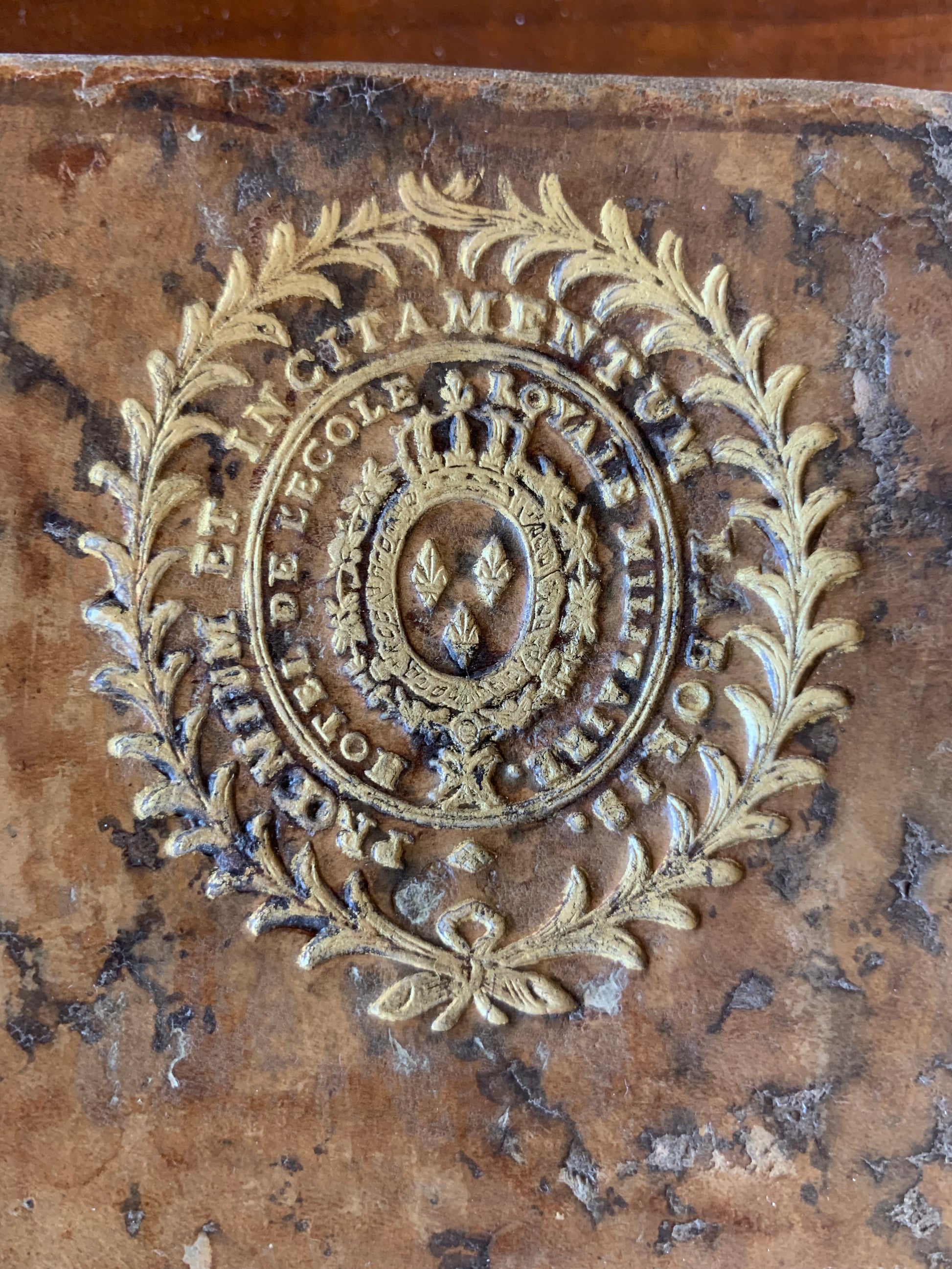 Ouvrage complet en 4 tomes reliés plein veau, premiers plats aux armes de l'Hôtel de l'école royale militaire, Dos lisse orné et monogrammé avec titre doré pour les tomes 2, 3 et 4 et dos orné à cinq nerfs, pièce de titre et titre doré pour le tome 1, tranches groseille