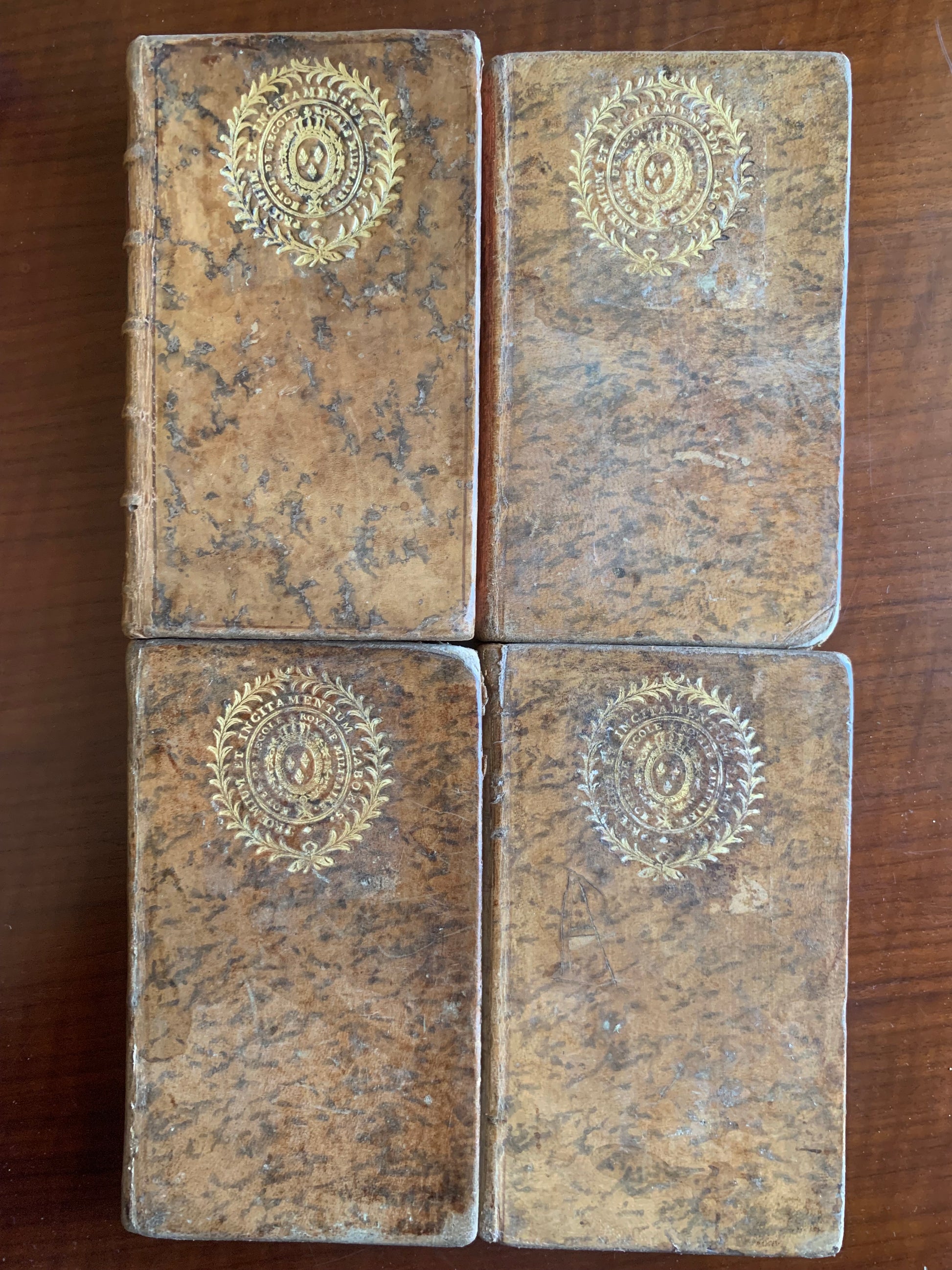 Ouvrage complet en 4 tomes reliés plein veau, premiers plats aux armes de l'Hôtel de l'école royale militaire, Dos lisse orné et monogrammé avec titre doré pour les tomes 2, 3 et 4 et dos orné à cinq nerfs, pièce de titre et titre doré pour le tome 1, tranches groseille