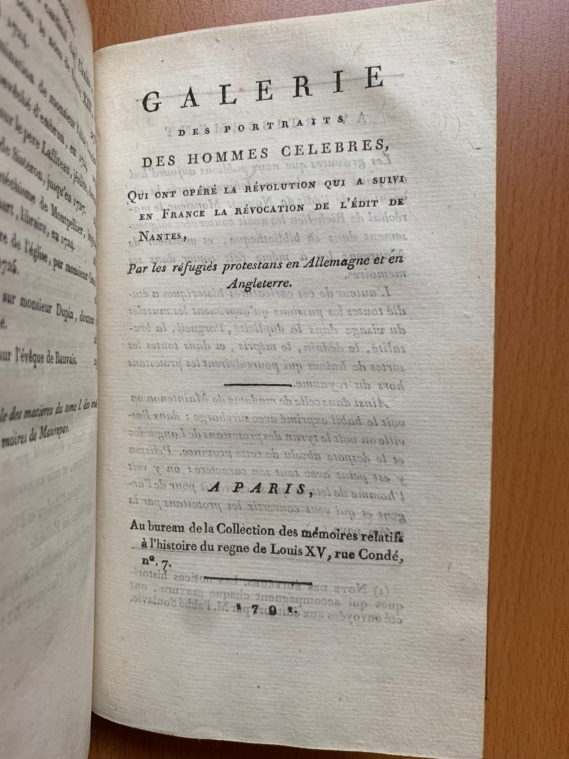 Tome 1 : 8 pages de préface des éditeurs + 296 pages avec table des matières + Galerie des portraits des hommes célèbres, qui ont opéré la révolution qui a suivi en France la révolution de l'édit de Nantes, par les réfugiés protestants en Allemagne et en Angleterre [1792] de 2à pages et complet de ses 11 carricatures.