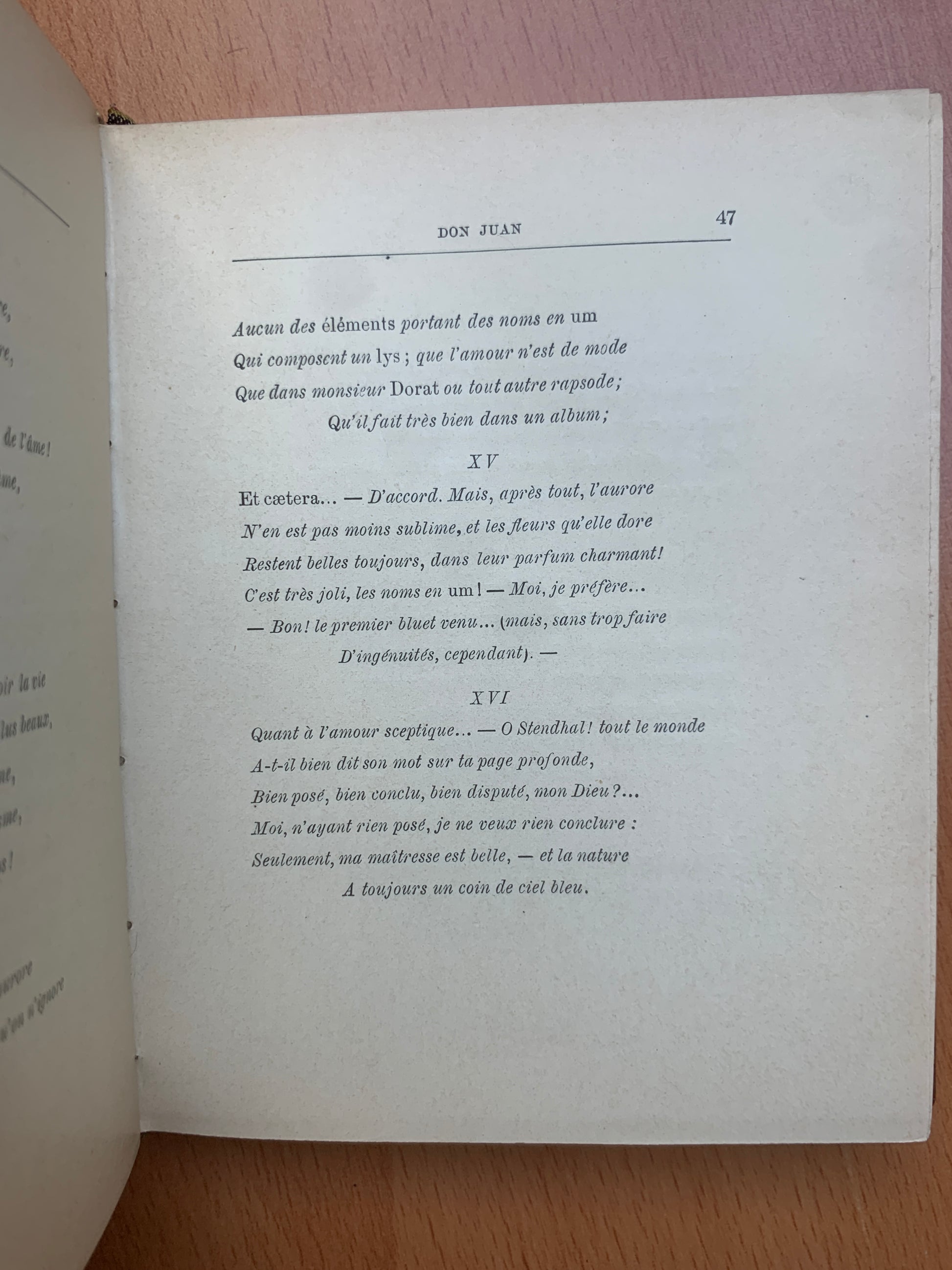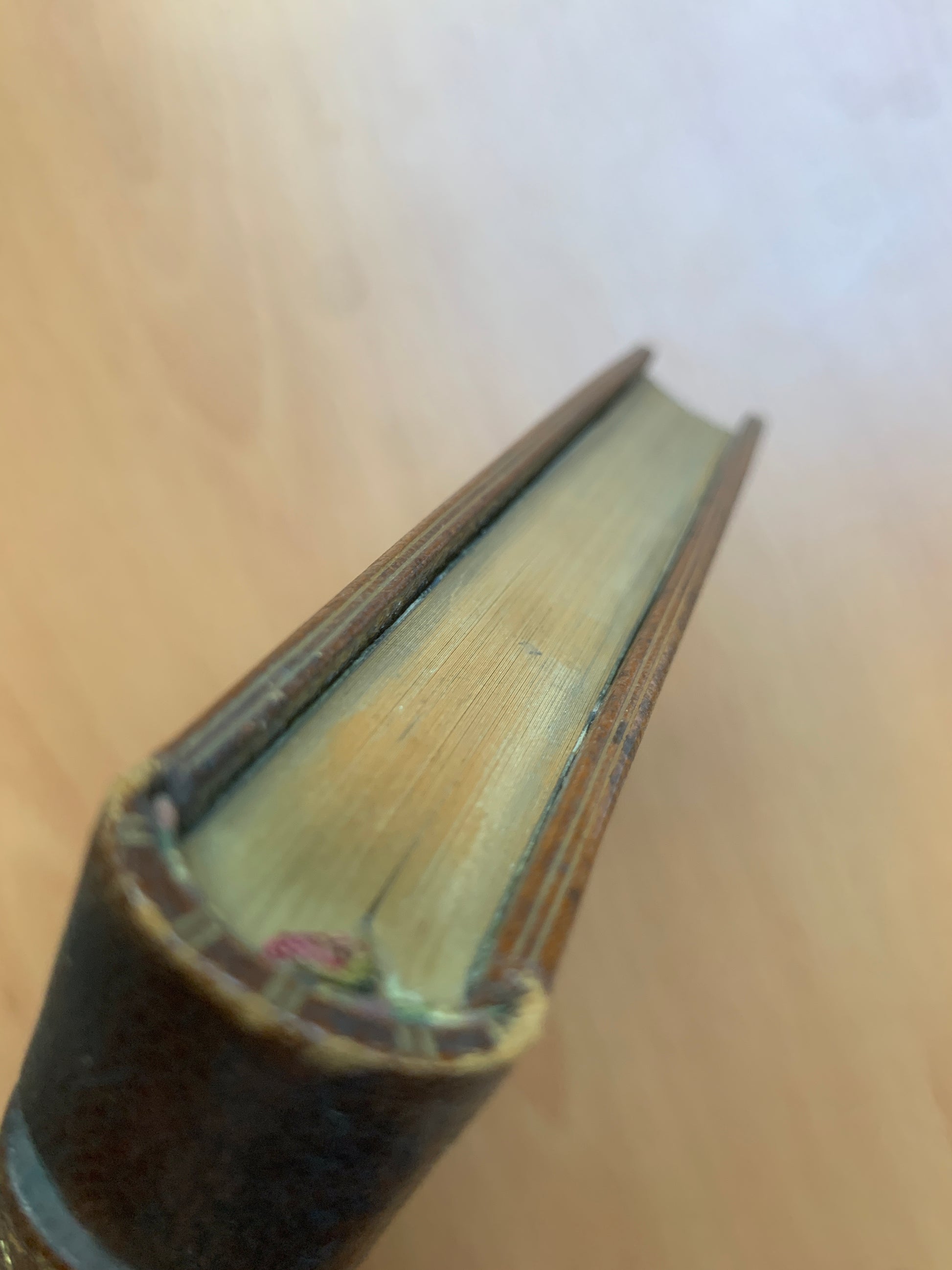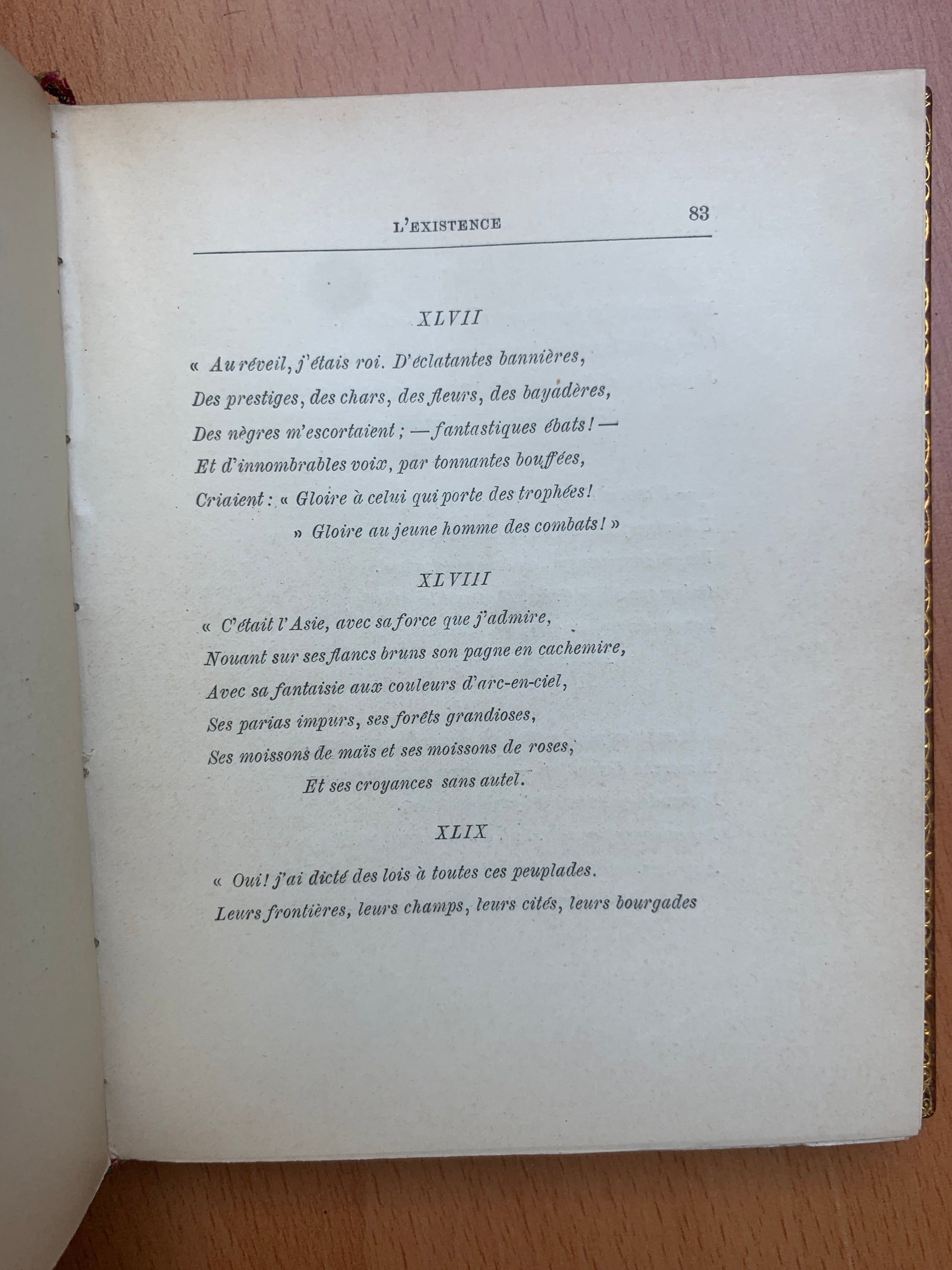 Ouvrage relié plein maroquin et plats décorés, dos à cinq nerfs, pièce de titre et titre doré, triple filet doré sur les chasses, roulette dorée sur les contreplats, tranche supérieure dorée.