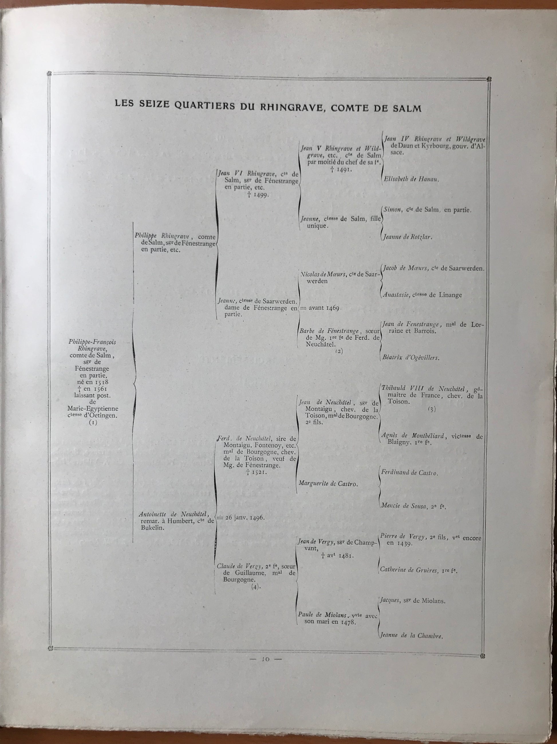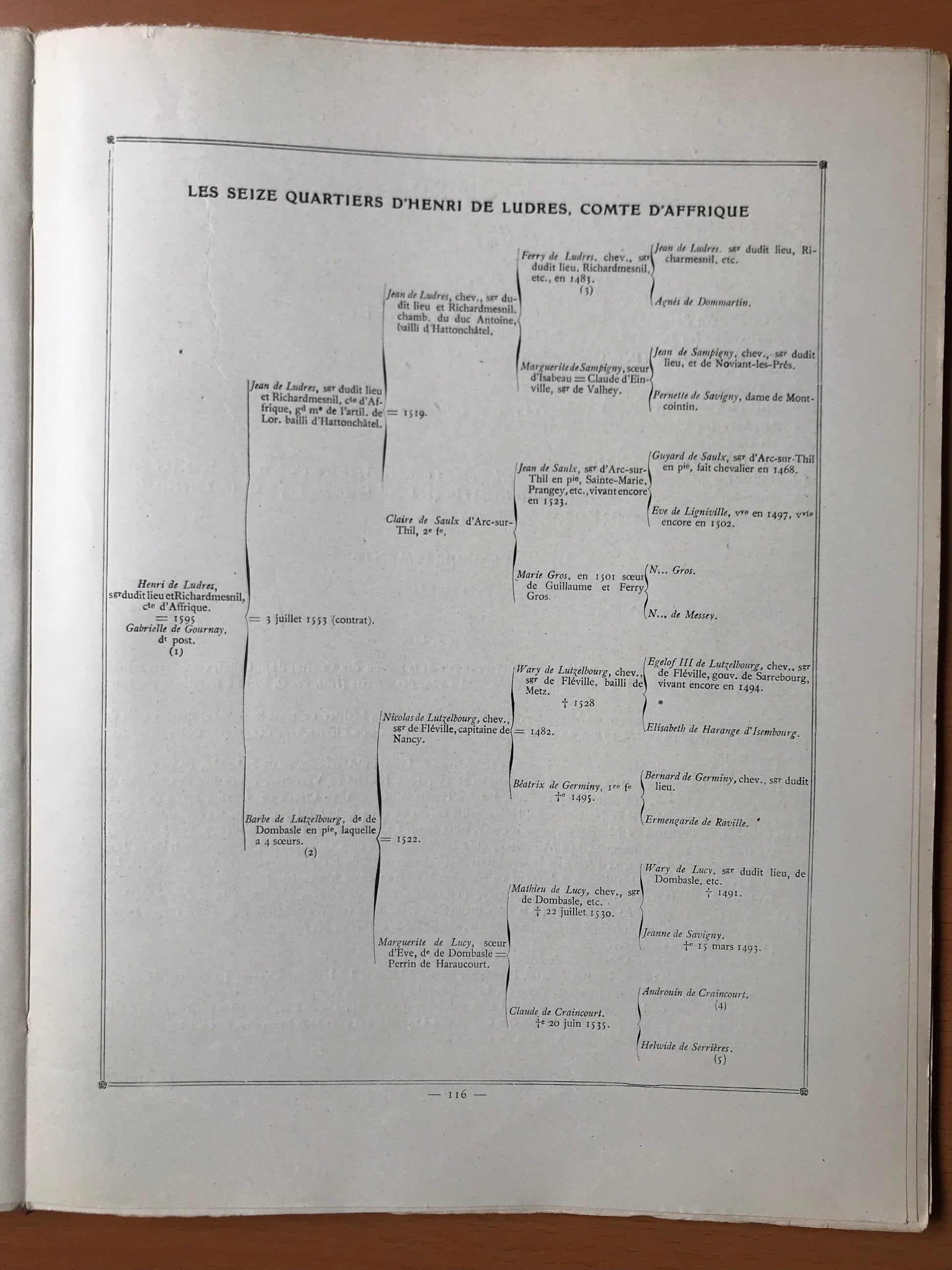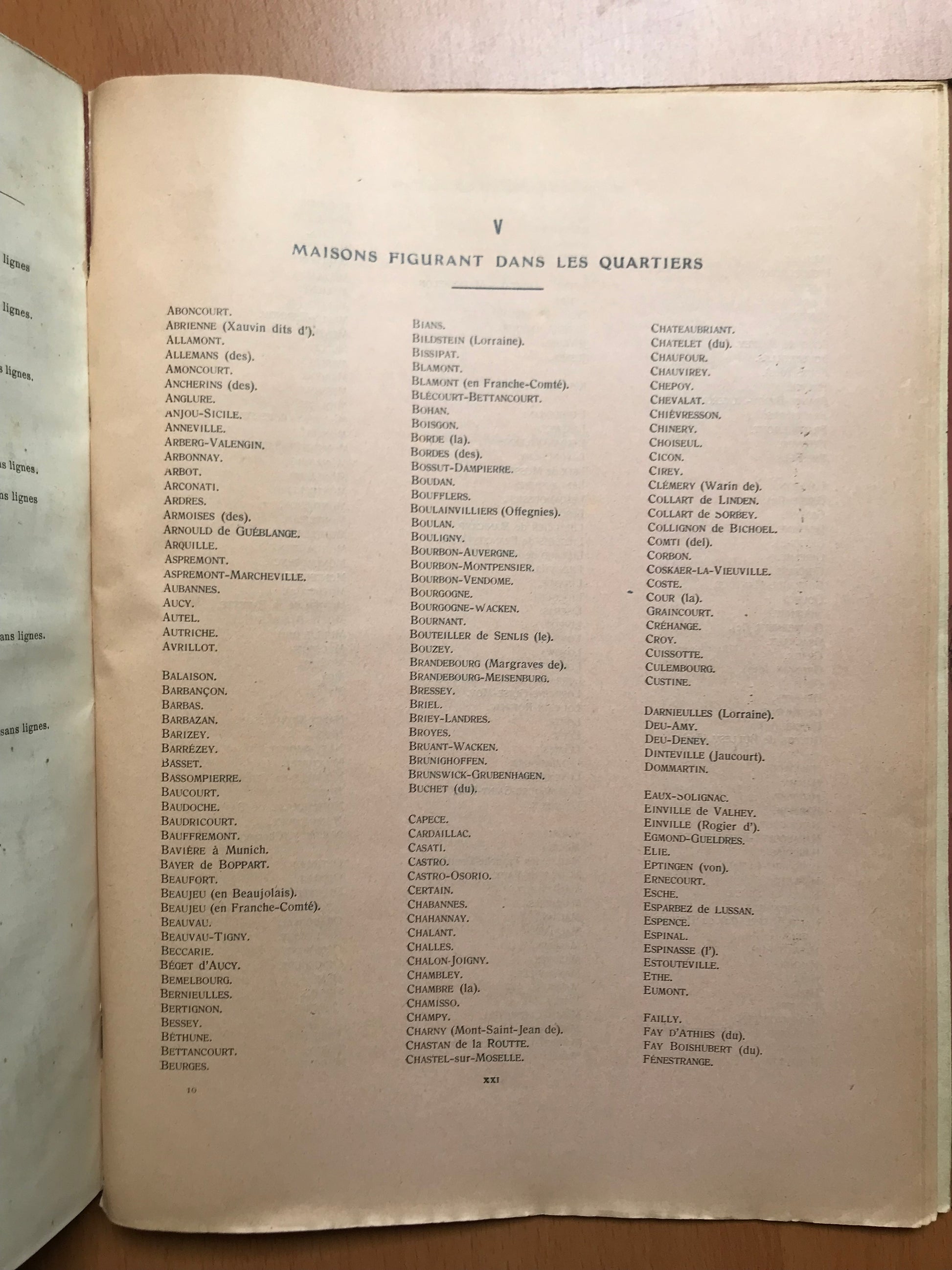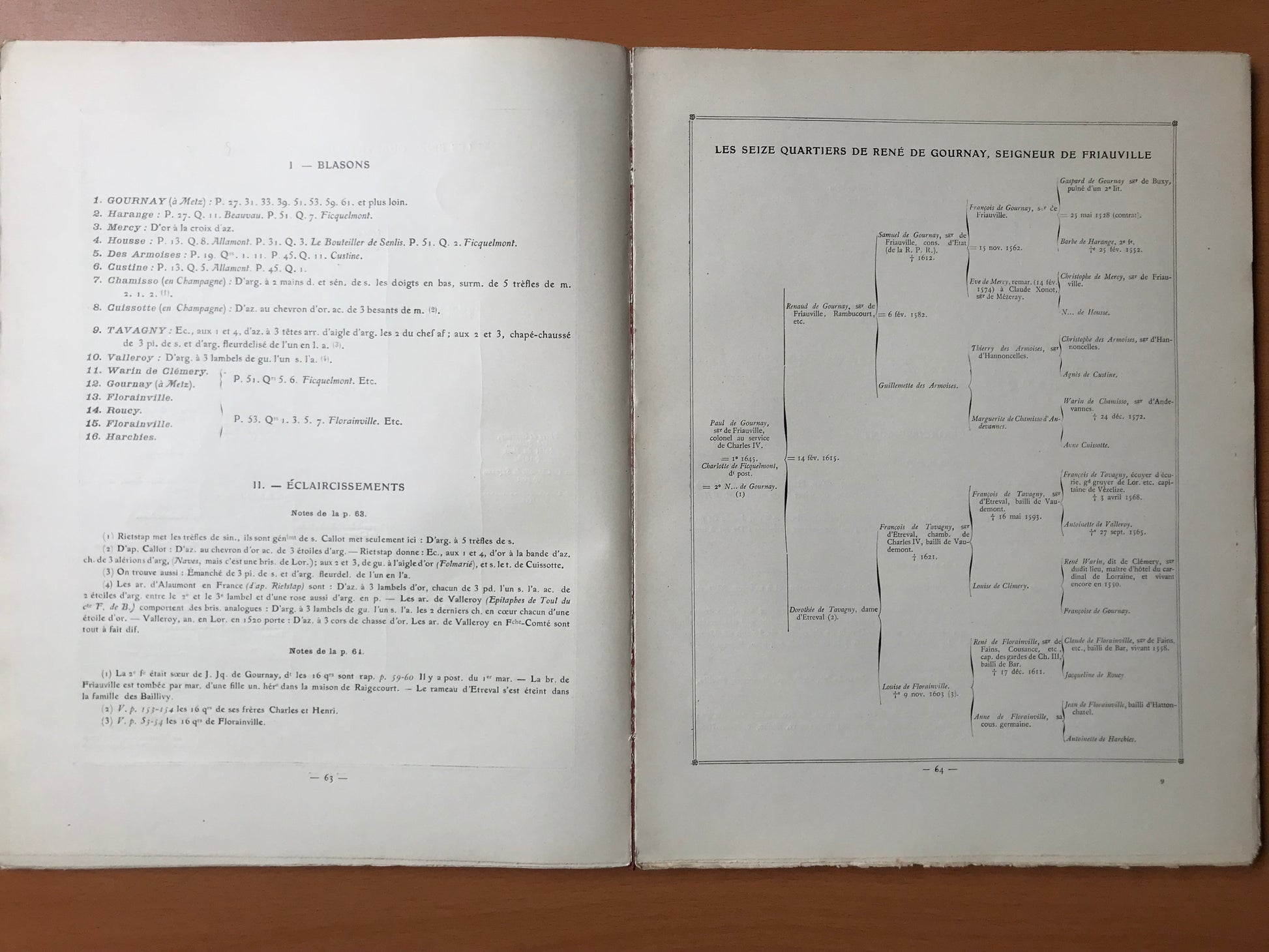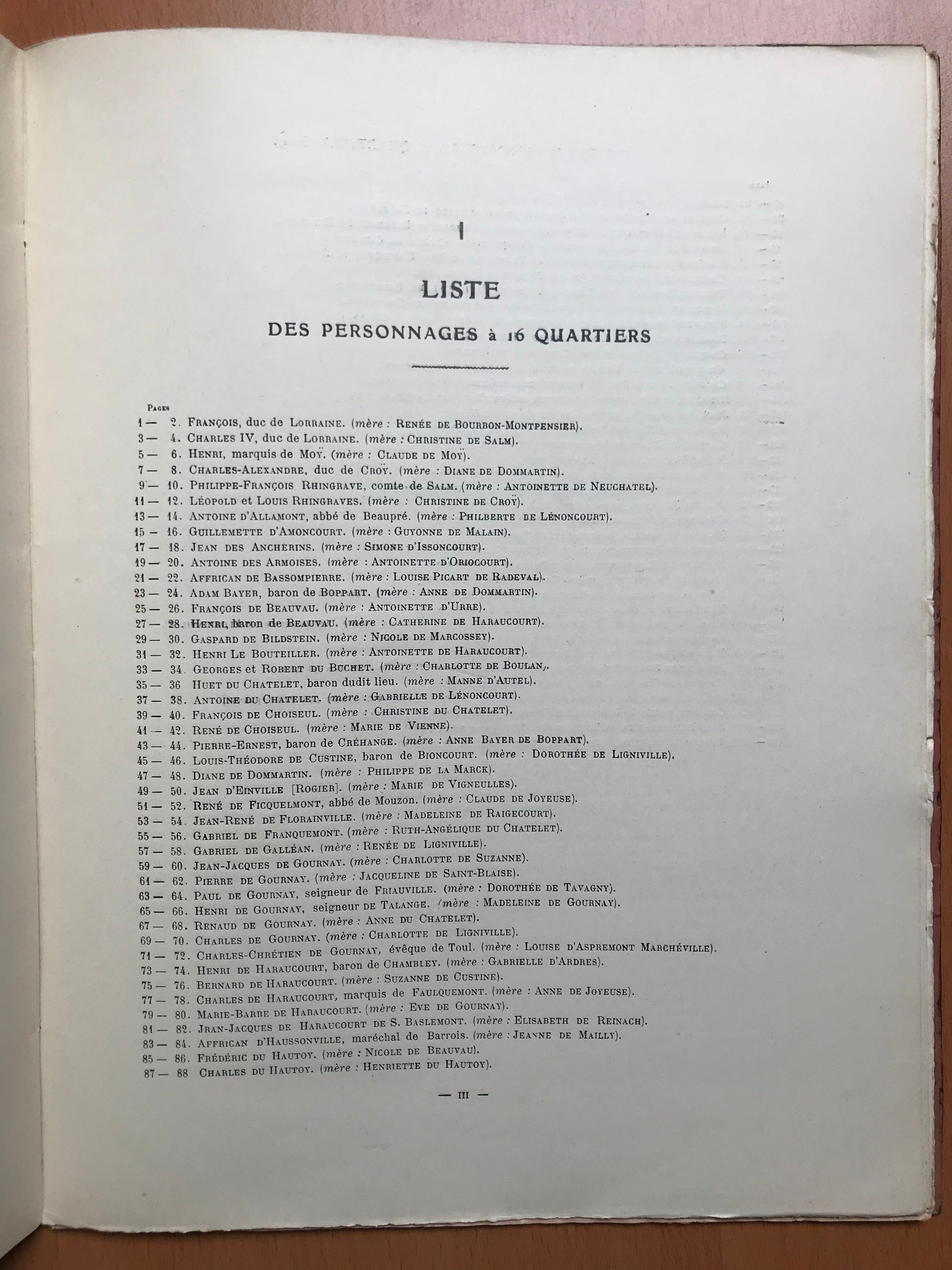 - Puis 35 pages de table des noms ; Personnages à 16 quartiers ; Concordance entre Husson et Callot ; Maisons dont les 8 quartiers se trouvent rapportés ; Concordance avec les articles détachés du "Simple crayon" ; Maisons figurant dans les quartiers ; table générale des noms de famille.