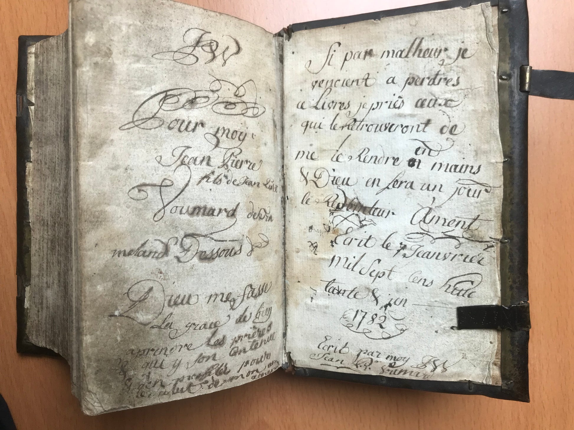 5 pages de notes manuscrites et ex libris ; 3 en fin d'ouvrage et 2 au milieu de l'ouvrage, famille "(Jean Pierre) Voumard de Tramelan(d)"