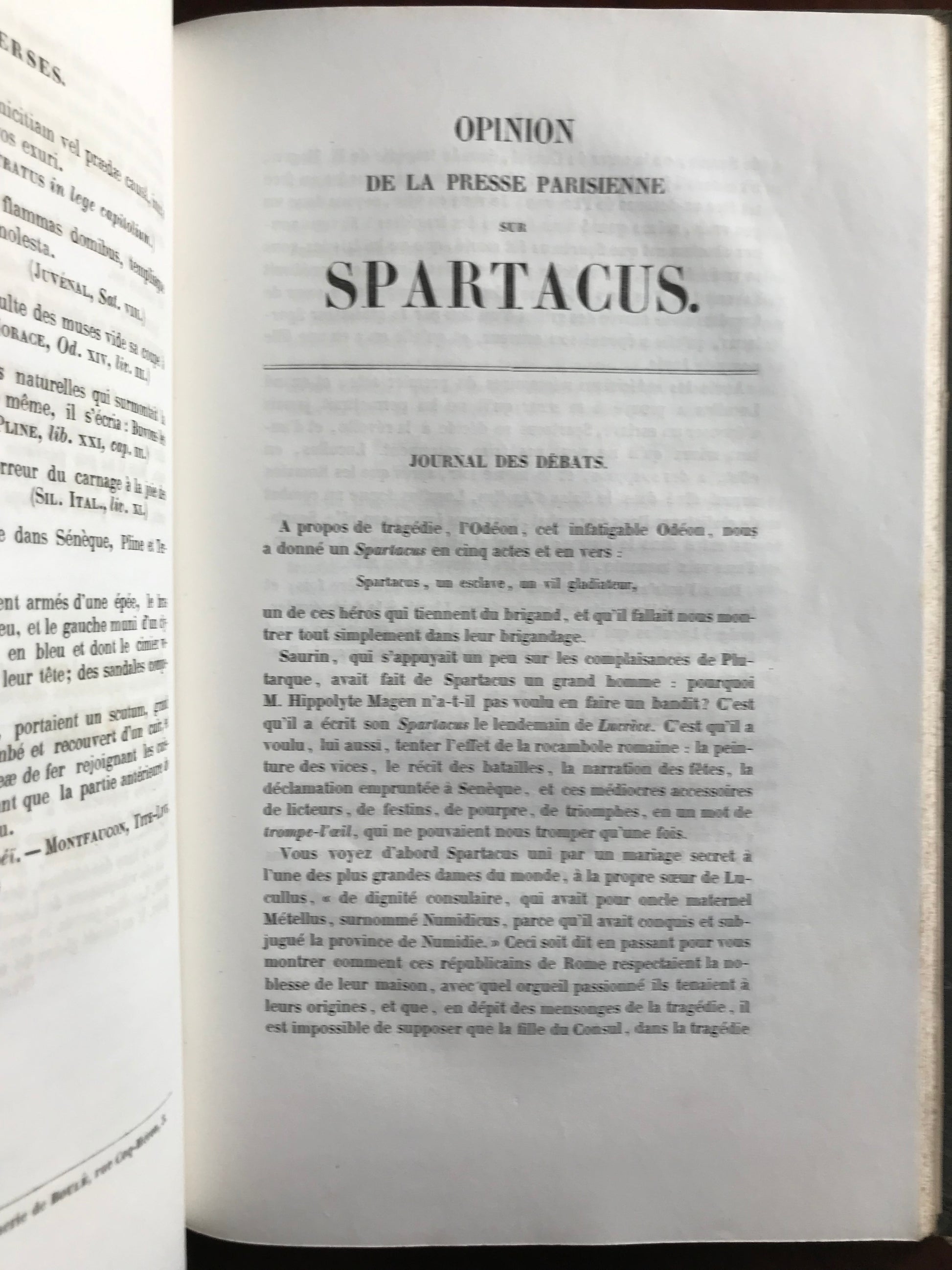 74 pages et, reliées à la suite, 38 pages des opinions de la presse parisienne sur Spartacus