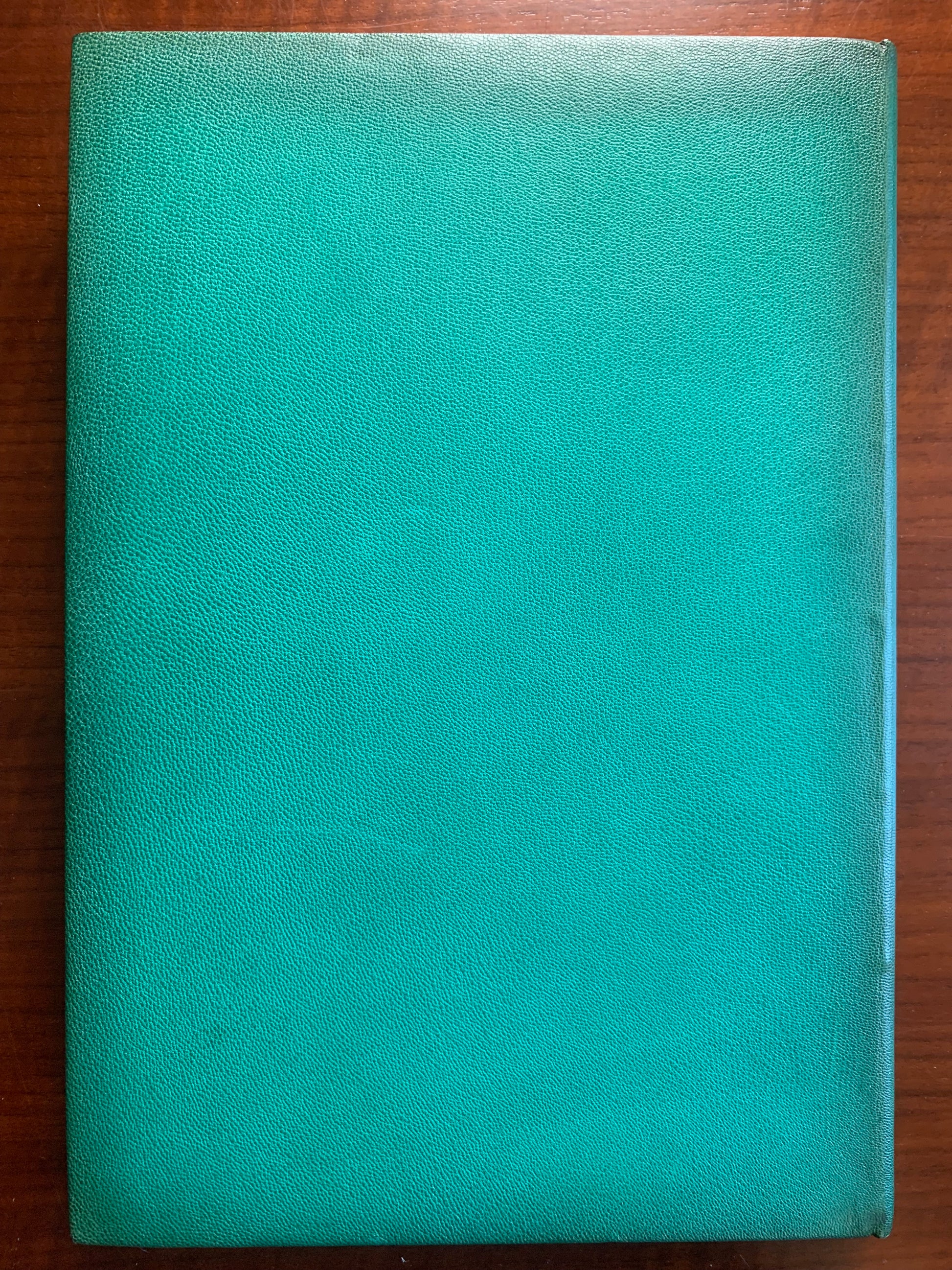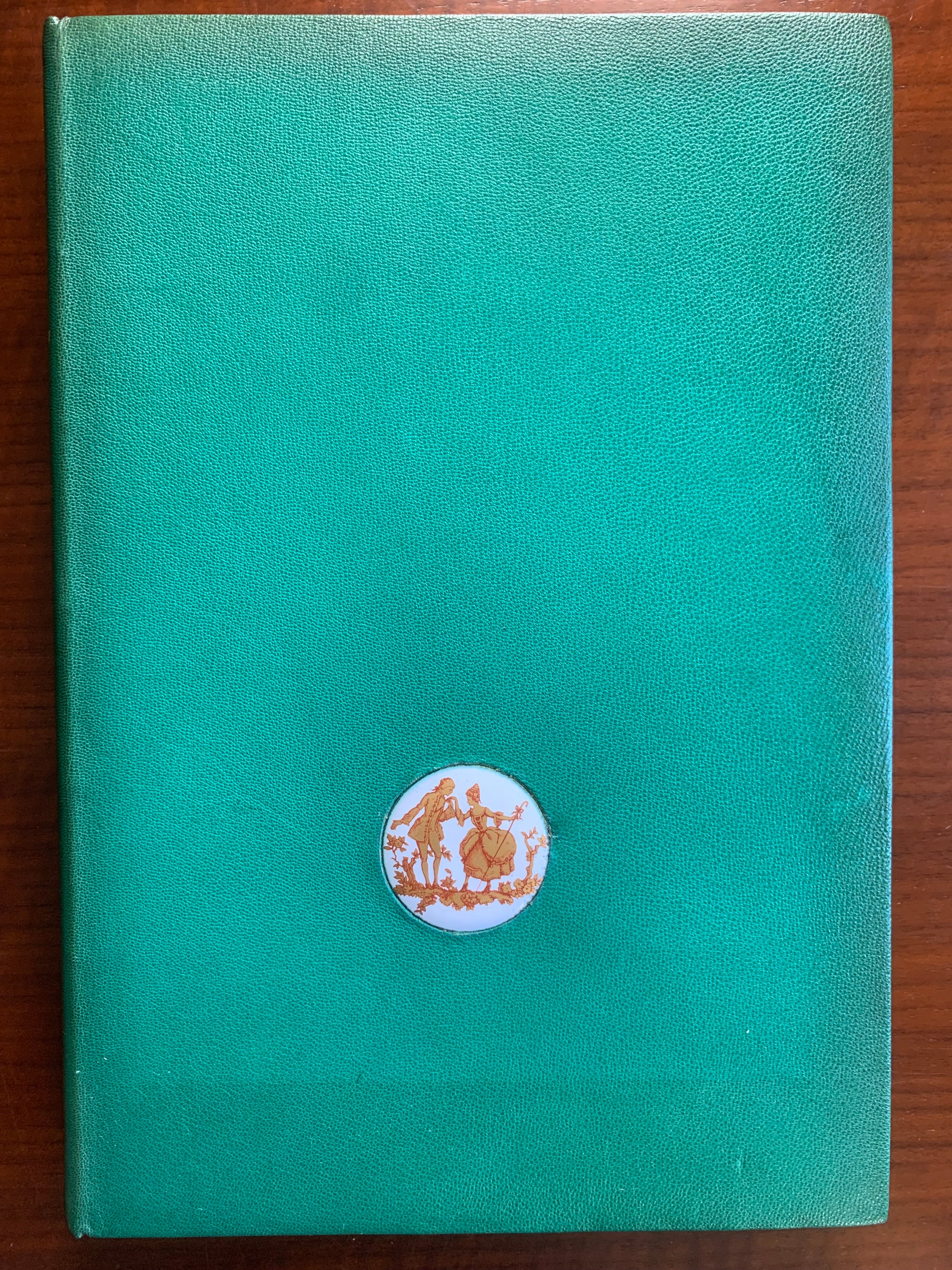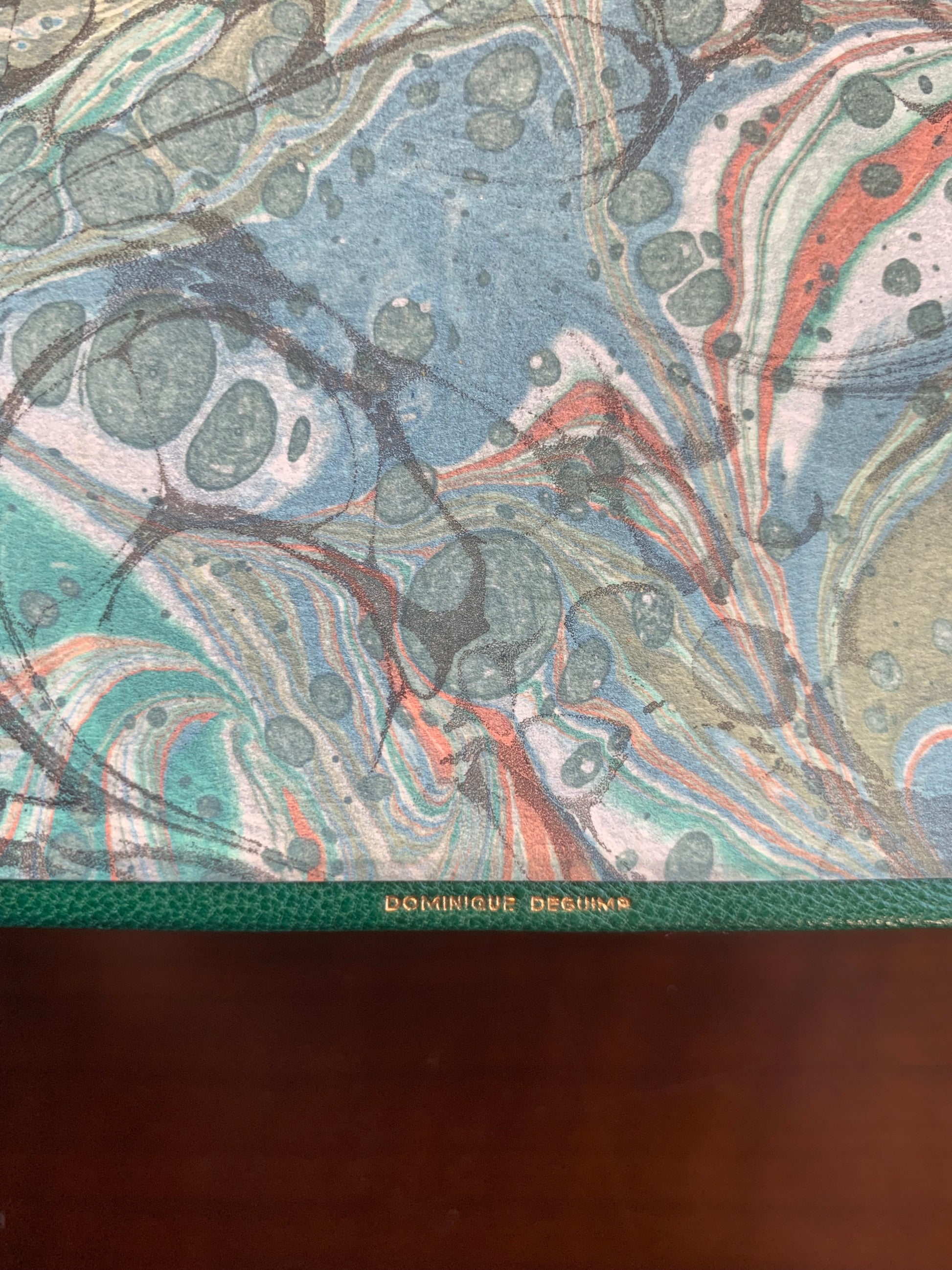 Ouvrage relié plein chagrin vert et premier plat orné d'un cabochon blanc et personnages dorés, dos lisse et titre doré, tranches supérieure dorée. Reliure signée Dominique Deguimp et ex-libris de Dominique Deguimp.